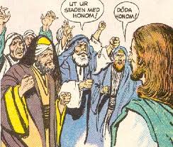 Matt.23:13 Ve er, skriftlärda och fariseer, ni hycklare! Ni stänger himmelriket för människor. Själva kommer ni inte in, och dem som försöker komma dit hindrar ni att komma in.15 Ve er, skriftlärda och fariseer, ni hycklare! Ni far omkring över land och hav för att göra någon till en proselyt, och när han har blivit det, gör ni honom till ett Gehennas barn, dubbelt värre än ni själva.16 Ve er, ni blinda ledare! Ni säger: Om någon svär vid templet, betyder det ingenting. Men om någon svär vid guldet i templet, då är han bunden vid sin ed. — 23 Ve er, skriftlärda och fariseer, ni hycklare! Ni ger tionde av mynta, dill och kummin men försummar det som är viktigast i lagen: rätten, barmhärtigheten och troheten. Det ena borde ni göra utan att försumma det andra. 24 Ni blinda ledare! Ni silar mygg och sväljer kameler.25 Ve er, skriftlärda och fariseer, ni hycklare! Ni rengör utsidan av bägaren och fatet, men inuti är de fulla av rofferi och omåttlighet. 26 Du blinde farisé, gör först insidan av bägaren ren, så blir också utsidan ren.27 Ve er, skriftlärda och fariseer, ni hycklare! Ni liknar vitkalkade gravar. Utanpå ser de vackra ut, men inuti är de fulla av de dödas ben och allt slags orenhet. 28 Så är det också med er. Utanpå ser ni ut att vara rättfärdiga, men inuti är ni fulla av hyckleri och ondska.29 Ve er, skriftlärda och fariseer, ni hycklare! Ni bygger profeternas gravar och pryder de rättfärdigas minnesstenar 30 och säger: Om vi hade levt på våra fäders tid, skulle vi inte ha varit med om att utgjuta profeternas blod.31 Därmed vittnar ni om er själva, att ni är söner till dem som mördade profeterna. 32 Fyll då också ni era fäders mått!33 Ni ormar, ni huggormsyngel, hur skall ni kunna undgå att dömas till Gehenna?