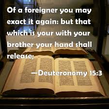 Gud gjorde skillnad på behandlingar mellan israeliter och ”utlänningar” i landet. Ingen av dem skulle behandlas illa, men när det gäller israelitiska bröder och systrar så ansåg Gud att lån inte skulle krävas tillbaka i all evighet, utan snarare efterskänkas under friåret. Inte heller vore det listigt att ta ifrån dem kläder och verktyg som de behövde för att arbeta och klara sig själva. Han menade vidare att fattiga aldrig skulle komma att saknas i landet (något liknande sa Jesus under sin tid), men bland israeliterna själva borde det dock inte finnas några fattiga eftersom Gud välsignat trogna israeliter såpass mycket att de lätt skulle kunna hjälpa varandra. Notera kravet på trohet till Gud, vilket alltså är kravet för att kunna förvänta sig välsignelse så till den grad att de även skulle kunna hjälpa andra ekonomiskt: